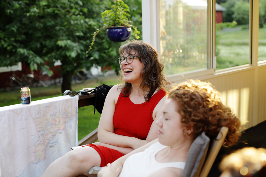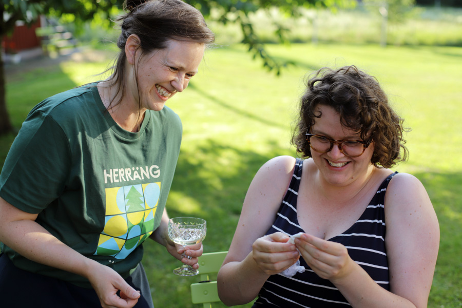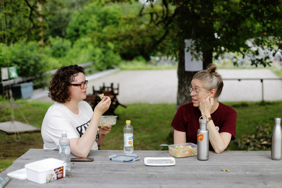 Paus mellan lektionerna med Christin, Karin och pastasallad. Vi hade ett så himla bra system med stora laddningar pastasallad som man kunde ta ur kylen och ta med till lektionerna varje dag. Herräng hacks indeed!