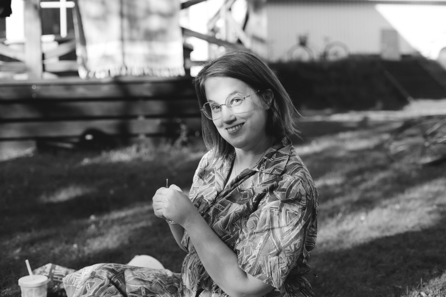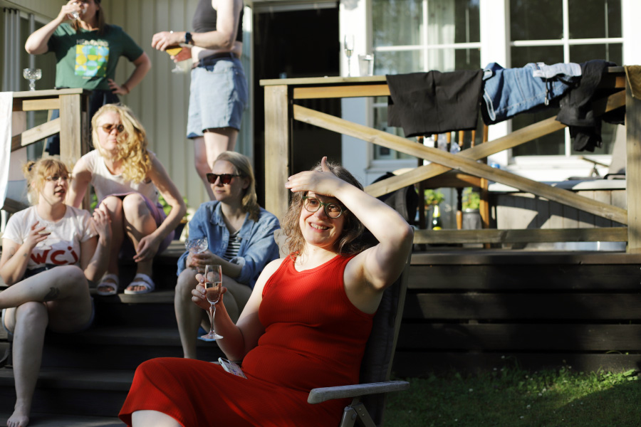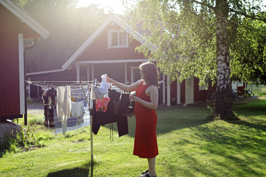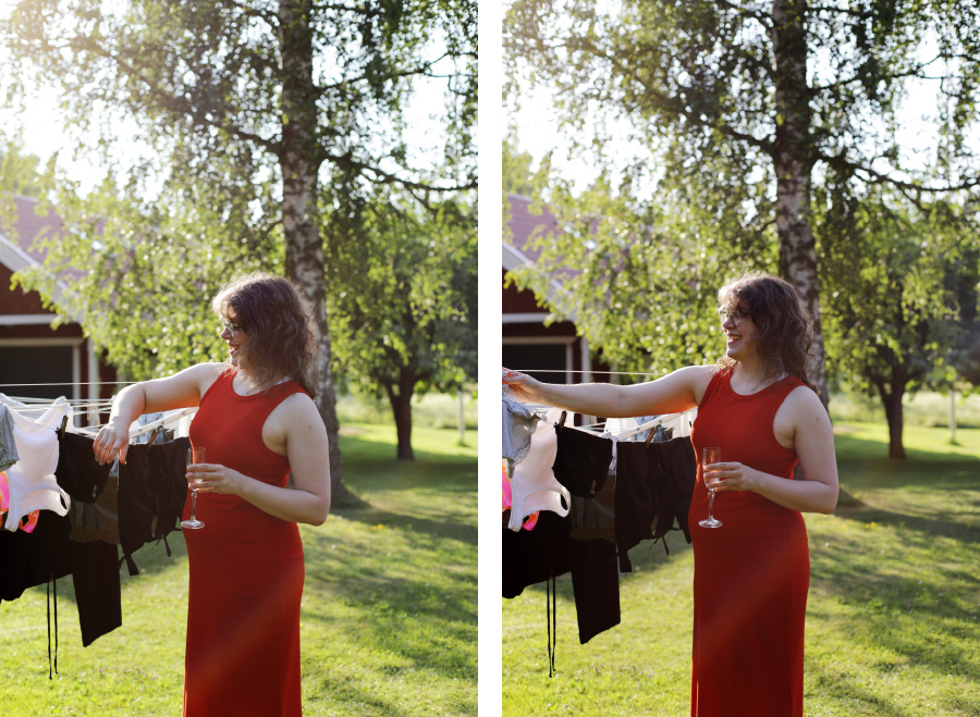 Tove passade på att kolla om tvätten torkat med ett glas bubbel i handen. :)