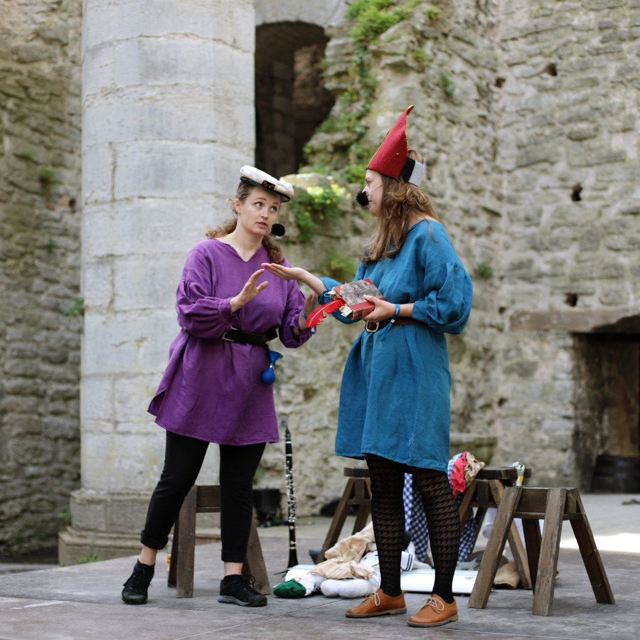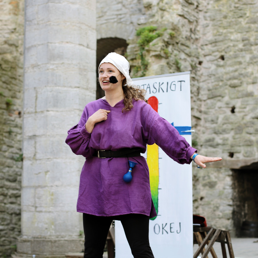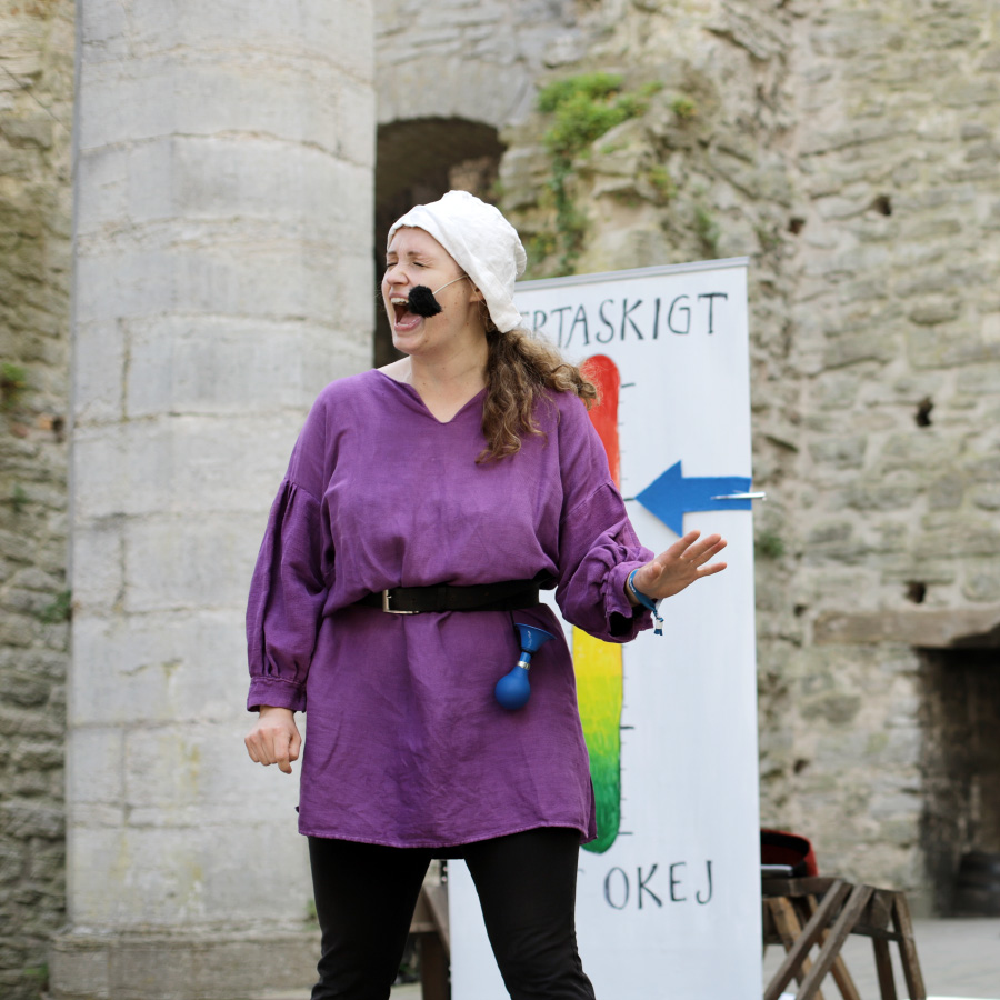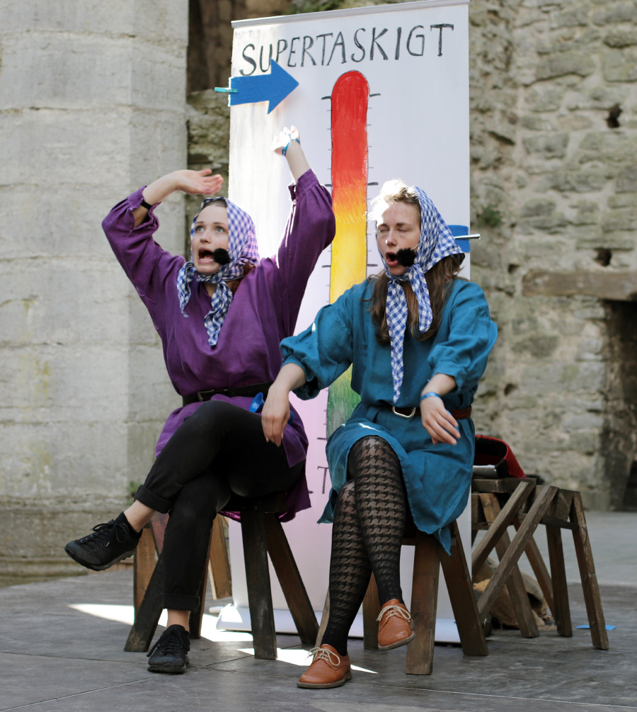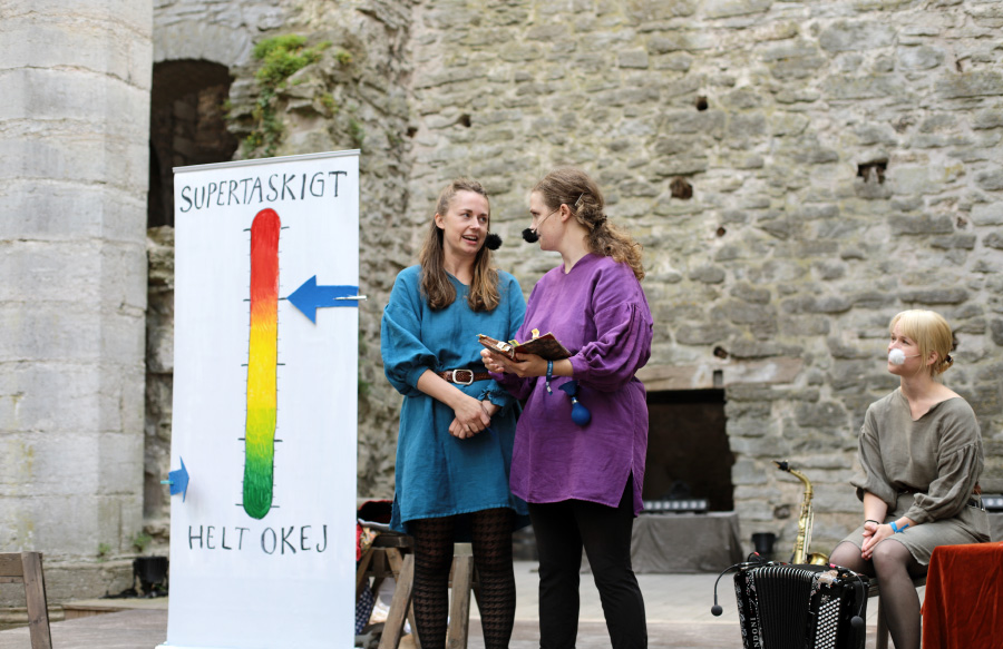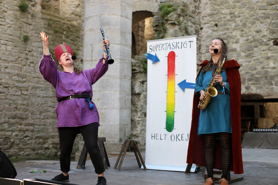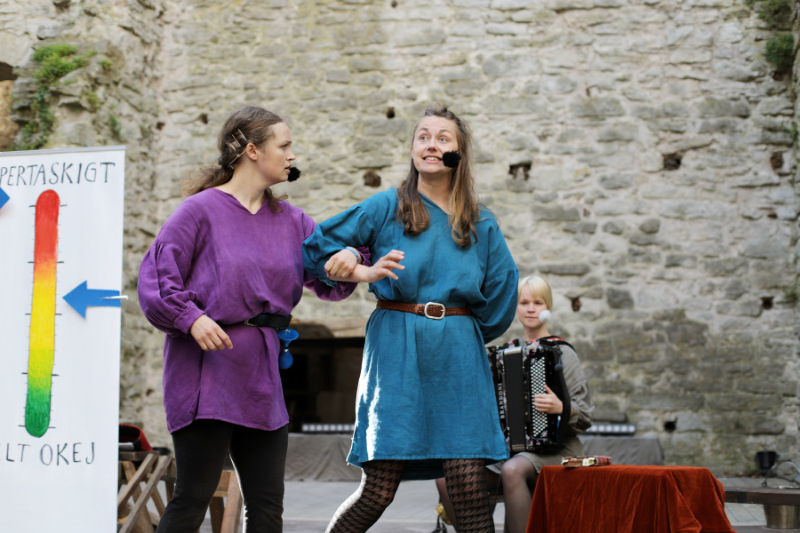 Det var toppenmusikalen Sveriges medeltida landskapslagar - the musical, av och med Två otrevliga flickor. Vi såg den 2022 också och den är fantastisk, så vi var många som ville se den. Det blev lite av en snackis resten av veckan och jag hörde många tipsa andra om den. Kolla bara, man ser nästan på bilderna hur bra och rolig den här föreställningen är: