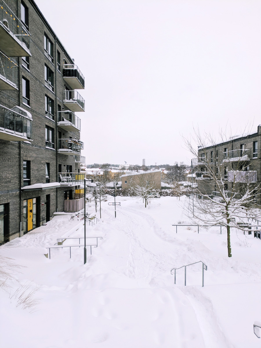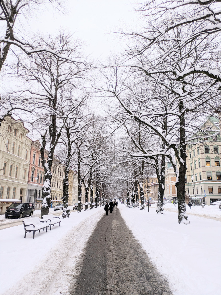 Sen kom snön - på riktigt! Det hade snöat lite dagarna innan förstås; jag gick ju på den här fina promenaden på trettondagen, som var en tisdag. Men det var natten efter den promenaden som det verkligen tumlade ned snö från himlen. Och när jag vaknade på onsdagen såg Vasastan ut såhär.