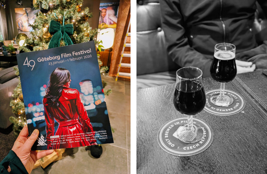 Vi tittade in på Draken och hämtade ett filmfestivalsprogram, och sedan klev vi över till Bishops och beställde två små glas mycket mörk mycket stark stout av olika sorter, som vi delade på.