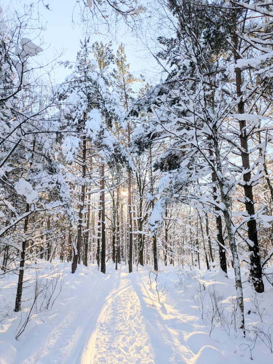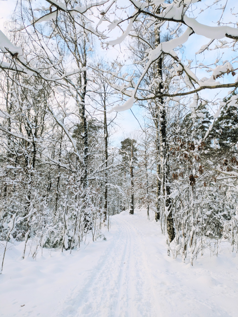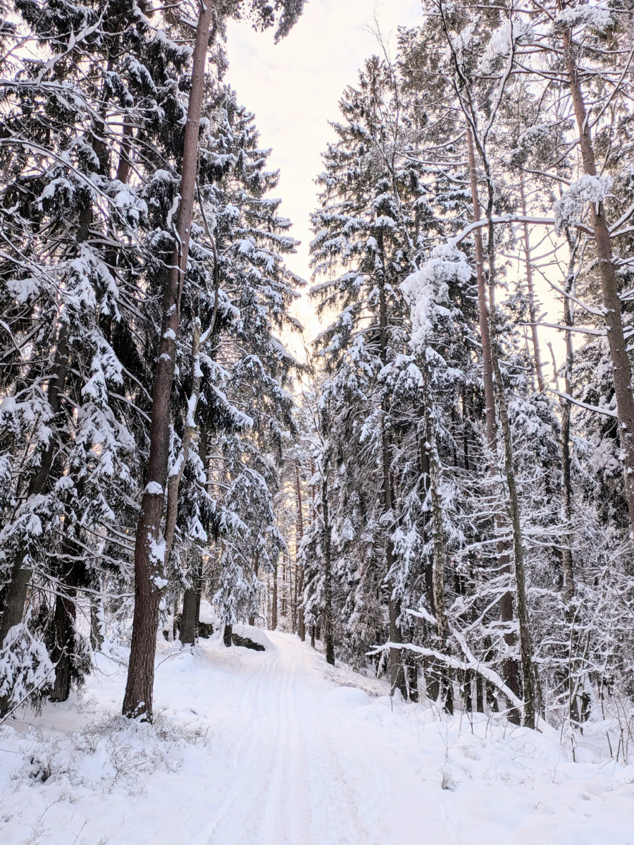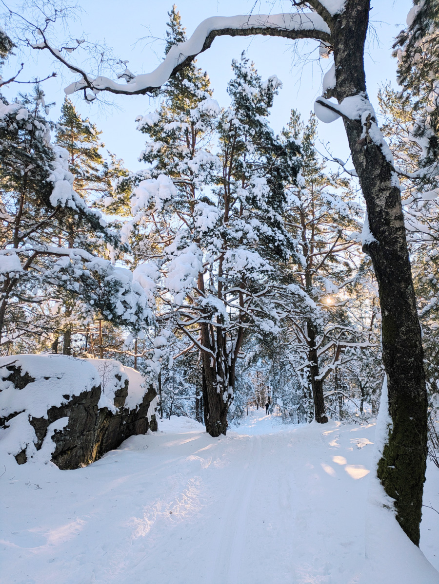 Annars tycker jag att milen i Skatås är riktigt tråkig - bara träd, träd och träd och ingen utsikt någonstans ifrån. Men nu! Med snötyngda träd och vackert ljus mellan grenarna uppe på höjden!