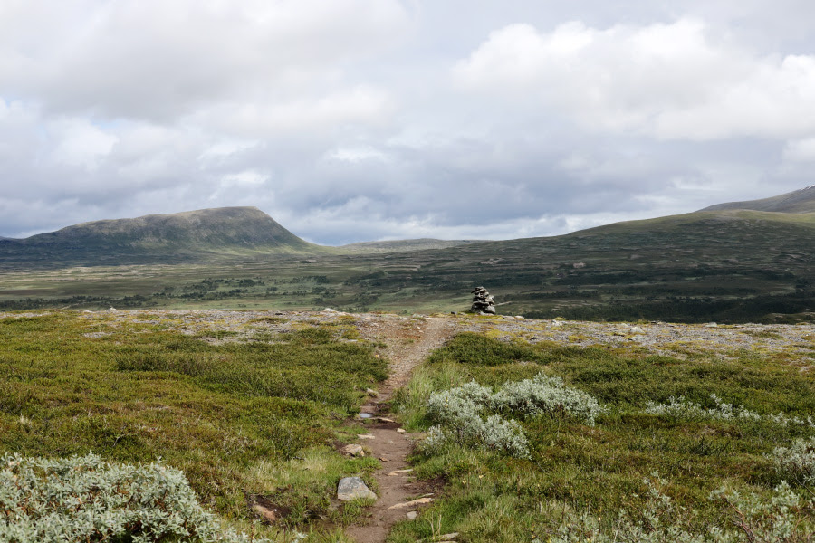 Och sedan märkte jag att regnet ökade i styrka igen så då blev det bara till att trava på i regnet ännu en gång. Vid det här laget var jag så härdad att jag bara tänkte "jaha, då tar vi rond fyra då, regnet!". Ja förlåt, jag förstår att det blir enformigt att jag bara skriver om huruvida det regnade eller var uppehåll. Det är bara så oerhört viktigt, på fjället, vilket väder det är. Jag känner mig aldrig så utsatt som då.