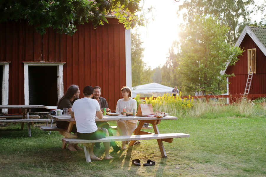 Det här är kanske den mest talande bilden för det här konventet, i alla fall för mig som förstagångsbesökare. Man tar ett bord och ställer ut det någonstans där man vill spela (det var hemskt varmt, så vi ville sitta ute i skuggan). Folks handdukar och badkläder på tork i bakgrunden (för naturligtvis finns det en badsjö också). Kaffemuggar, någons bortglömda tofflor, en av mina saftflaskor på marken under bordet där barnet på bilden lekt med den tidigare. Allt var så mysigt här.