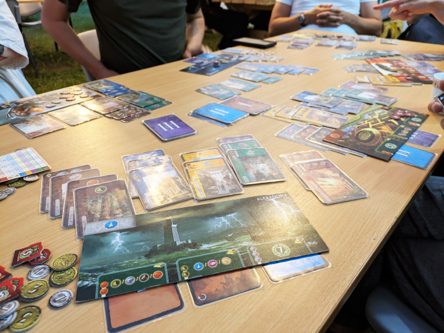 Och sedan 7 Wonders, som jag också kan sedan innan. Och vad intressant det är att spela ett vant spel med nytt folk, som spelar annorlunda jämfört med mitt gäng (alltså inte med andra regler, men med annan taktik).