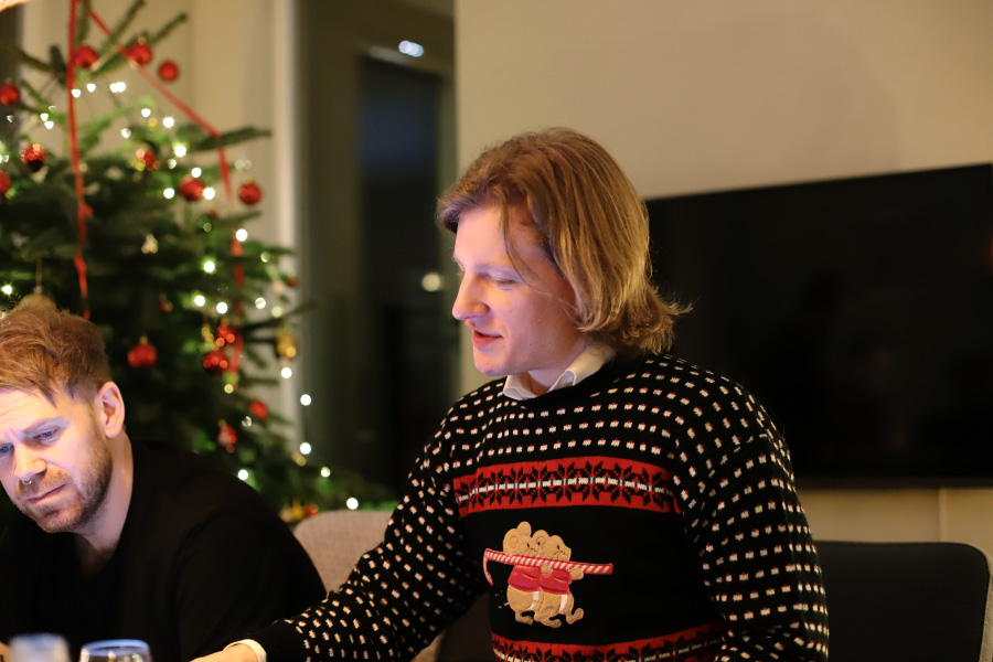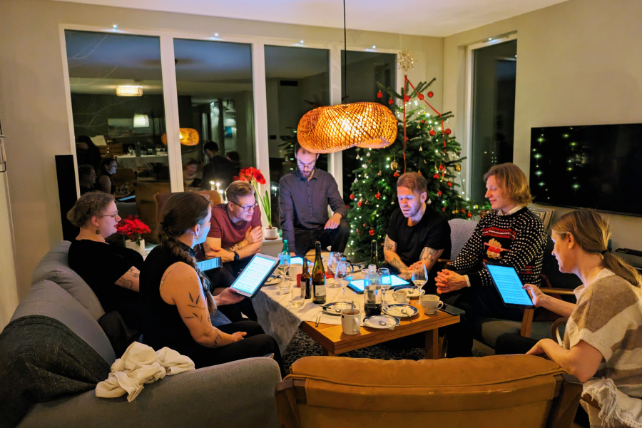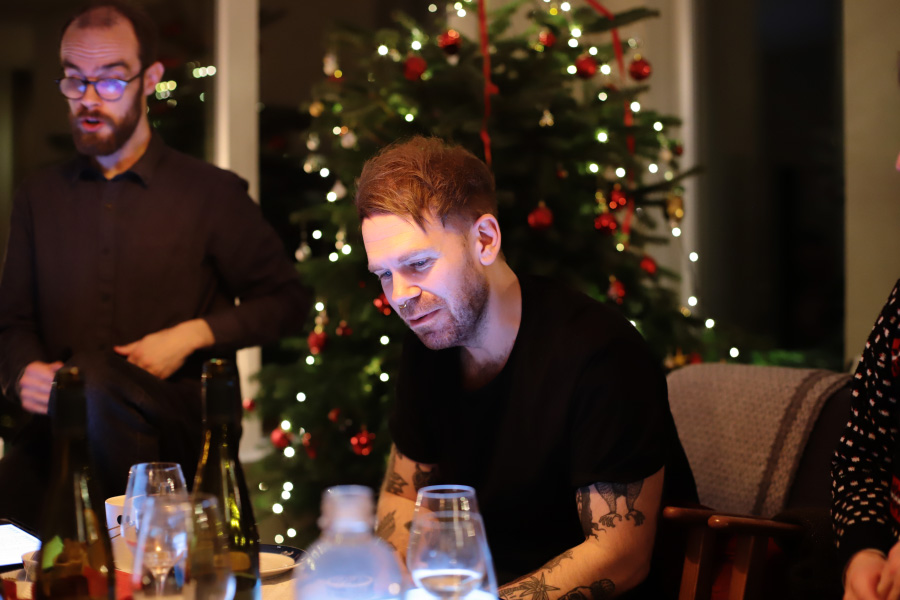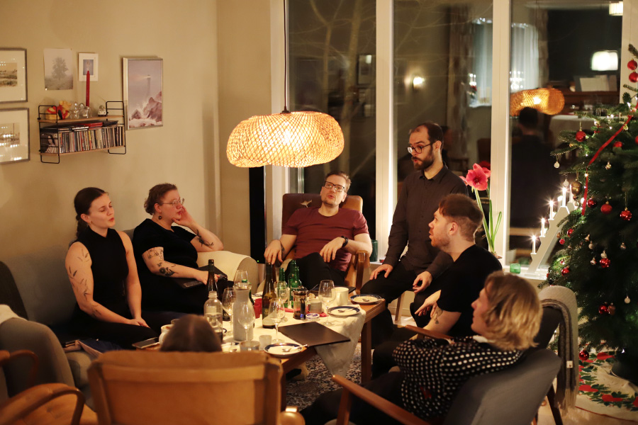 Fredagen före julafton hade vi julfest med min vokalensemble. Julfest med vokalensemblen går ut på att vi äter god mat och sedan sjunger en massa låtar direkt från bladet. Med varierat resultat ... men alltid roligt och härligt. :) I år var vi hos Anna och Gustav i Ljungskile. De hade gjort så fint och mysigt och vi fick ett glas med smarrig fördrink i handen så fort vi kommit innanför dörren.