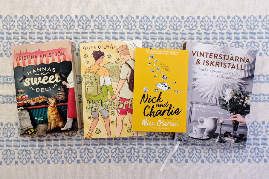 Köpte dessa fyra: En feelgoodroman som säkert är trevlig. En av Heartstoppervolymerna (har egentligen ingen önskan om att äga fler eftersom jag läst dem alla redan, men för 30 kr fick den ändå följa med hem). Nick and Charlie (kortromanen som är ursprunget till hela Heartstopper och som jag egentligen inte gillar eftersom Alice Oseman skrev den för så länge sedan och karaktärerna har utvecklats åt ett lite annat håll de senaste tio åren ... men eftersom jag älskar Heartstopper så mycket är den ändå kul att ha). Och en pysselbok som jag tänker att jag ska ställa till med en bjudning kring i november, så att det säkert blir av att jag använder den. Vore så mysigt att sitta ett gäng kring ett bord och vika stjärnor, tänker jag.