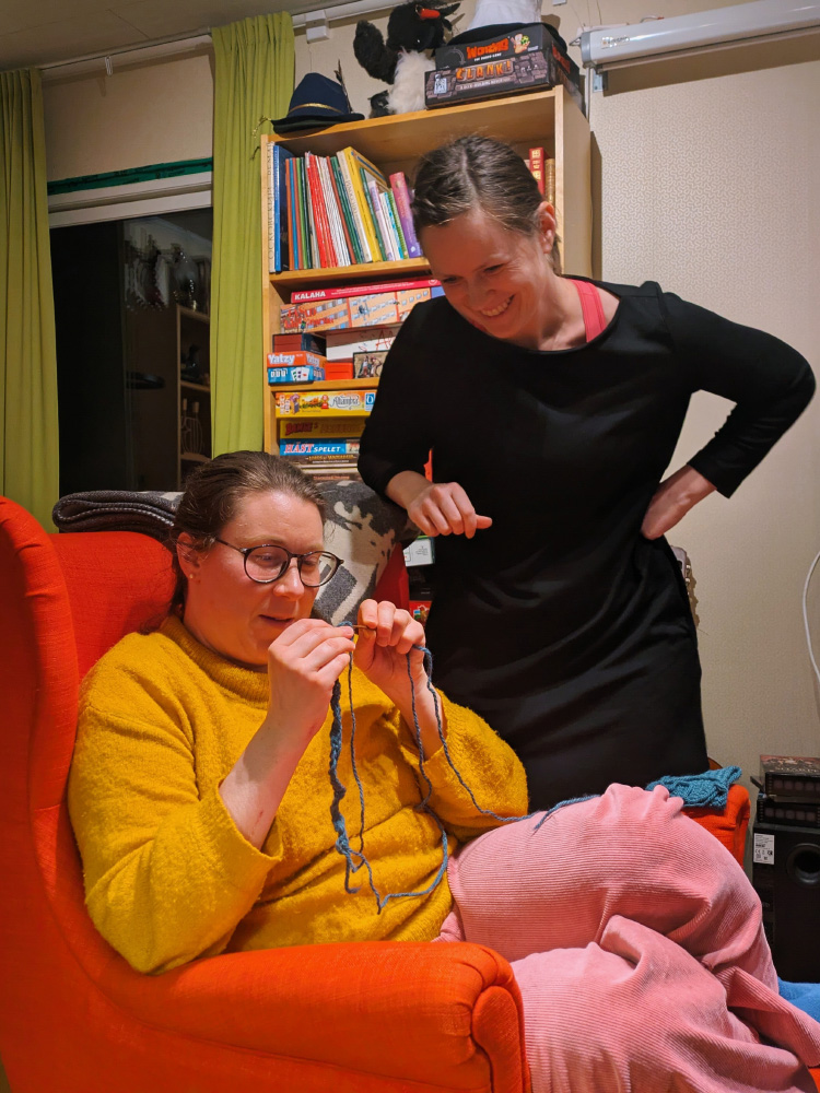 Och så pysslade vi med allehanda grejer. Lisa övade sig på nålbindning och Anna-Karin sydde knapphål i jackan av Chaneltyg hon håller på att sy (när hon inte hjälpte Lisa med nålbindningen). Själv sydde jag i trådar i resåren i alla mina svarta strumpbyxor (har i alla fall tolv par eller så) så att jag ska veta om det är 100 denier (gul tråd) eller 40 denier (ljusblå tråd) utan att behöva sträcka ut dem först. Smartaste jag kommit på!